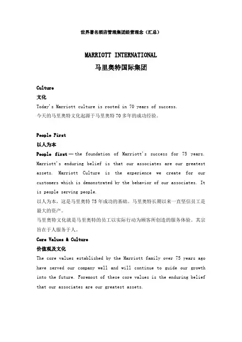 世界著名酒店管理集团经营理念(汇总)MARRIOTT INTERNATIONAL马里奥特国际集团Culture文化Today's Marriott culture is rooted in 70 years of success.今天的马里奥特文化起源于马里奥特70多年的成功经验。