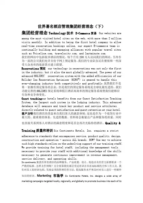 世界著名酒店管理集团经营理念(下)集团经营理念Technology技术E-Commerce贸易Our websites areamong the most visited hotel sites on the web, with more than 2 million visits monthly. In addition to being the first hotel company to allow real-time reservation bookings online, our expert E-commerce team is continually building and managing alliances with popular travel sites such as , , and .我们的网站中包括很多酒店的情况。