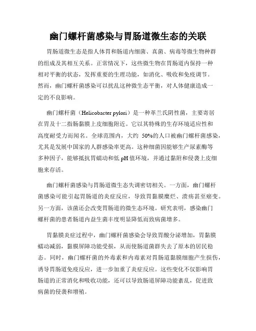 二、幽门螺杆菌感染与肠道菌群的关系1. 肠道微生态失衡幽门螺杆菌感染可以引起肠道微生态失衡,导致肠道菌群的数量和种类发生变化。