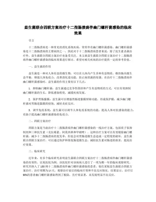 益生菌联合四联方案治疗十二指肠溃疡伴幽门螺杆菌感染的临床效果引言十二指肠溃疡是一种常见的消化系统疾病,常常伴有幽门螺杆菌感染。