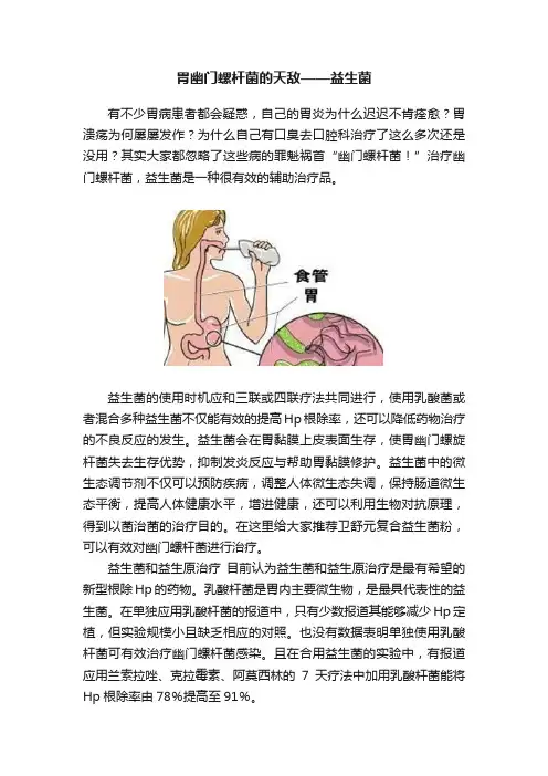 益生菌在根除幽门螺杆菌治疗中的临床疗效【摘要】益生菌在根除幽门螺杆菌治疗中发挥着重要作用,本文旨在探讨其临床疗效。