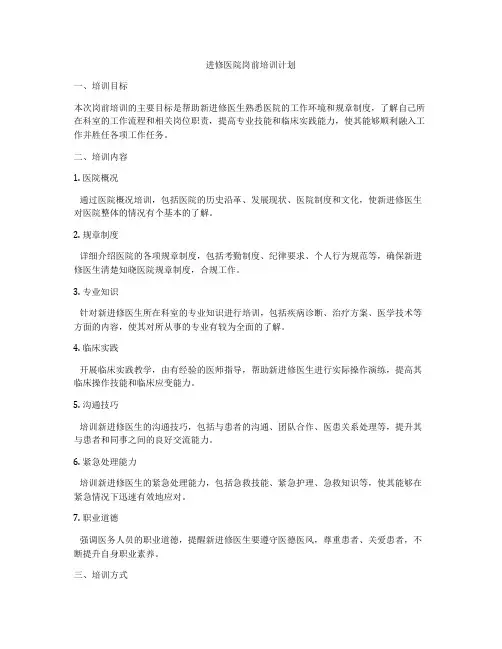 医院进修岗前培训计划一、前言医院进修岗前培训计划是为了帮助新进医生熟悉医院的工作环境、了解医院的规章制度,熟悉相关业务流程及相关操作规程,进而提高工作效率、提升工作质量。
