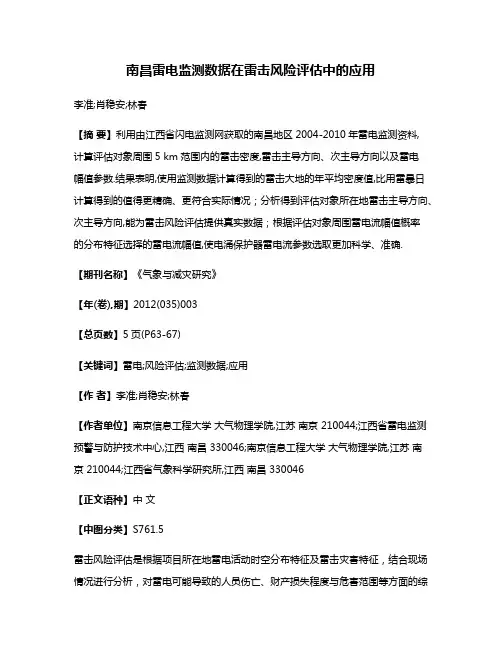 南昌雷电监测数据在雷击风险评估中的应用李准;肖稳安;林春【摘要】利用由江西省闪电监测网获取的南昌地区2004-2010年雷电监测资料,计算评估对象周围5 km范围内的雷击密度,雷击主导方向、次主导方向以及雷电幅值参数.结果表明,使用监测数据计算得到的雷击大地的年平均密度值,比用雷暴日计算得到的值得更精确、更符合实际情况;分析得到评估对象所在地雷击主导方向、次主导方向,能为雷击风险评估提供真实数据;根据评估对象周围雷电流幅值概率的分布特征选择的雷电流幅值,使电涌保护器雷电流参数选取更加科学、准确.【期刊名称】《气象与减灾研究》【年(卷),期】2012(035)003【总页数】5页(P63-67)【关键词】雷电;风险评估;监测数据;应用【作者】李准;肖稳安;林春【作者单位】南京信息工程大学大气物理学院,江苏南京 210044;江西省雷电监测预警与防护技术中心,江西南昌 330046;南京信息工程大学大气物理学院,江苏南京 210044;江西省气象科学研究所,江西南昌 330046【正文语种】中文【中图分类】S761.5雷击风险评估是根据项目所在地雷电活动时空分布特征及雷击灾害特征,结合现场情况进行分析,对雷电可能导致的人员伤亡、财产损失程度与危害范围等方面的综合风险计算。