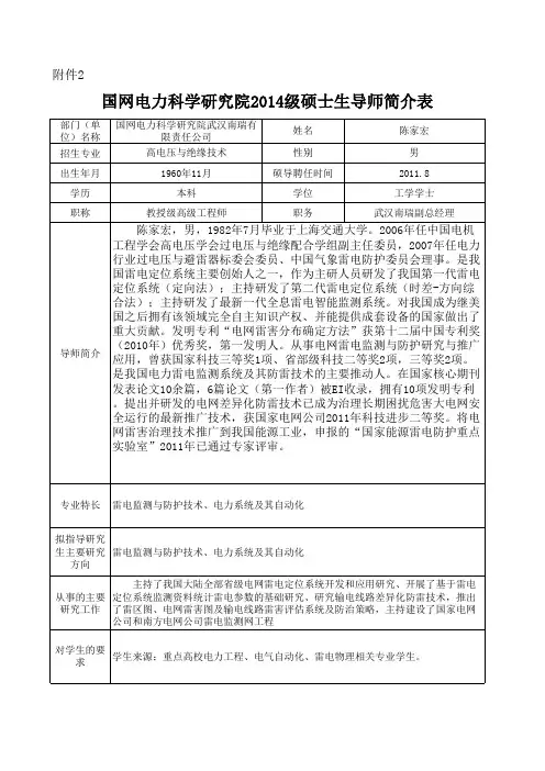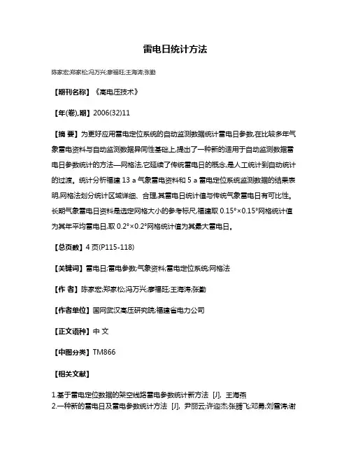 Project Supported by SGKJ(2005623).Statistical Method of Lightning ParametersCH EN Jia -hong,FENG Wan -xing,WANG H a-i tao,TONG Xue -fang ,LI Xiao -lan(Wuhan H ig h Voltage Research Institute of SGCC,Wuhan 430074,China)Abstract:T he L ightning Parameter s ar e v ery scarce in China no w,and tr aditio nal lig htning par ameters can no t fully reflect lig ht ning act ivities in var ious regions.T he longt ime massiv e detect ion data ga ined by advanced China Gr id Lightning D et ection Netw o rk (CGL DN )have beco me the basic data in statistic of lig htning par ameter s.T o g et co r -r ect lightning parameters based o n lig htning locatio n system,a concept of statistica l sam pling dat abase is presented,as w ell as the reasonable and acquisitive method fo r building the dat abase is g iven after intro ducing and analyzing the gr eat deal of detection data.T he paper pr esents the g rid method fo r statistic and analy sis o f so me r epr esentativ e lig htning parameters,such as thunder st orm day,flash densit y,C ,and so on,on the basis of the modern lig htning detectio n data.T he metho d and co nditions of comparing t he statistical r esult s w ith t raditio nal meteo ro log ical data are g iven.A pr oper ex pression for cumulative probability distributio n of clo ud -g round flashes curr ent amplitude is recommended.It is o f ver y impor tance and significance to g et a scientific,cano nical statistica l and analyt ical meth -o d,especially fo r study of com pr ehensive lig htning par ameters char acteristic and its distributio n r ule.Key words:lig htning parameters;lig hting location;det ection data;statistical sample;g rid method;compariso n0 引 言我国电网近年来的雷击闪络呈上升趋势,其原因是:¹雷电活动加剧,我国电网雷电监测网(China Gr id Lightning Detectio n Netw ork,CGLDN)资料显示,2004年至今,我国许多区域的雷电地闪密度明显增大[1];º新增电网提速,输电线路增长,杆塔增高,易遭雷击;»因缺乏对雷电活动及其分布规律的了解,防雷措施事倍功半。
