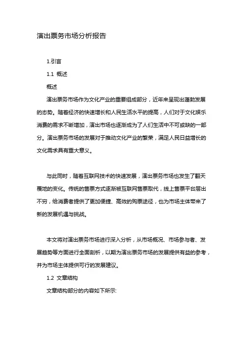 演出票务市场分析报告1.引言1.1 概述概述演出票务市场作为文化产业的重要组成部分,近年来呈现出蓬勃发展的态势。