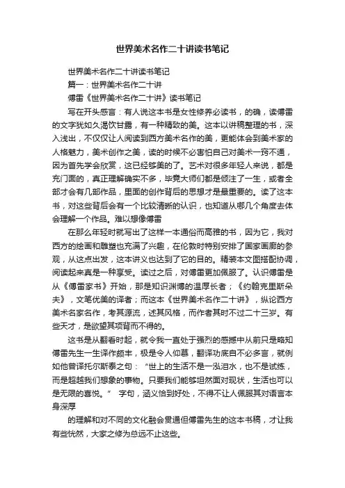 世界美术名作二十讲读书笔记世界美术名作二十讲读书笔记篇一:世界美术名作二十讲傅雷《世界美术名作二十讲》读书笔记写在开头感言:有人说这本书是女性修养必读书,的确,读傅雷的文字犹如久渴饮甘露,有一种精致的美。