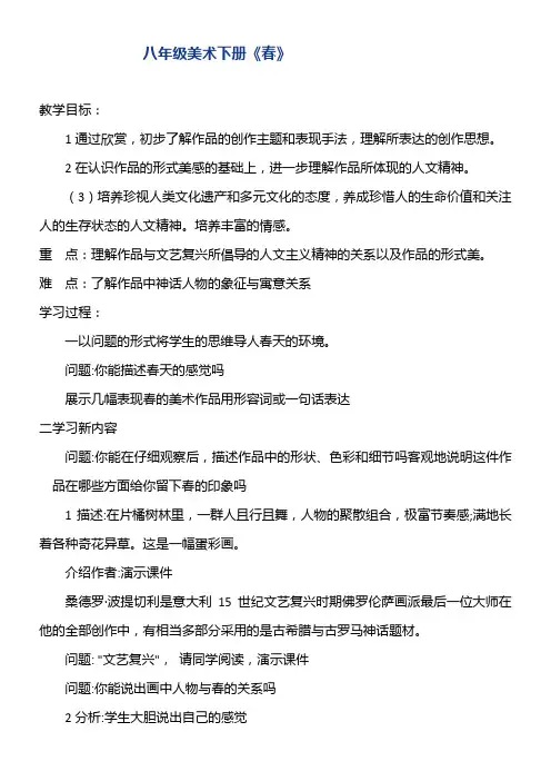 《文艺复兴的颂歌——春》【教学目标】1、知识与技能目标通过欣赏,初步了解作品的创作主题和表现手法,理解所表达的创作思想。