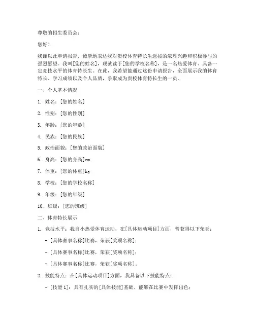 一、个人基本情况1. 姓名:[您的姓名]2. 性别:[您的性别]3. 年龄:[您的年龄]4. 民族:[您的民族]5. 政治面貌:[您的政治面貌]6. 身高:[您的身高]cm7. 体重:[您的体重]kg8. 学校:[您的学校名称]9. 年级:[您的年级]10. 班级:[您的班级]二、体育特长展示1. 竞技水平:我自小热爱体育运动,在[具体运动项目]方面,曾获得以下荣誉:- [具体赛事名称]比赛,荣获[奖项名称];- [具体赛事名称]比赛,荣获[奖项名称];- [具体赛事名称]比赛,荣获[奖项名称]。