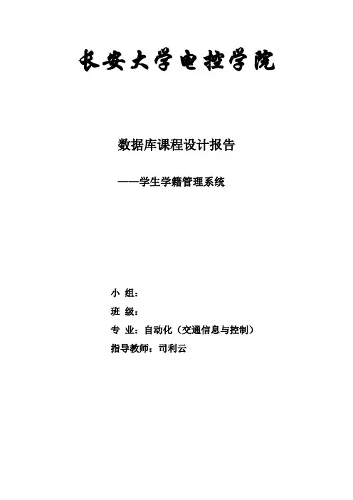 长安大学电控学院数据库课程设计报告——学生学籍管理系统小组:班级:专业:自动化(交通信息与控制)指导教师:***前言学生学籍管理系统一直是一个单位不可或缺的部分,他的内容对于学校决策者和管理者来说都很重要,所以学生学籍管理系统应该能够为用户提供足够的信息和快捷的查询手段。