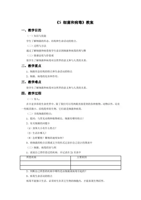 四、教学过程:1. 导入:通过展示PPT或图片,向学生介绍细菌和病毒的基本知识,引起学生的兴趣和好奇心。