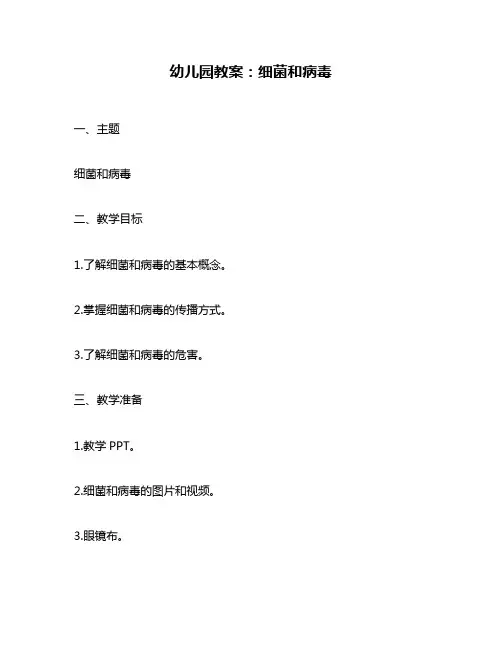 三、教学内容安排1. 什么是病毒和细菌?a. 通过图片、视频等形式向幼儿介绍病毒和细菌的外观和特点。