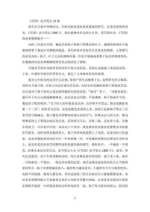 文档下载后可定制修改,请根据实际需要进行调整和使用,谢谢!并且,本店铺为大家提供各种类型的经典范文,如工作总结、合同协议、演讲致辞、策划方案、报告计划、条据书信、句子大全、教学资料、作文写作、其他范文等等,想了解不同范文格式和写法,敬请关注!Download tips: This document is carefully compiled by this editor.I hope that after you download it, it can help you solve practical problems. The document can be customized and modified after downloading, please adjust and use it according to actual needs, thank you!Moreover, this shop provides you with various types of classic sample essays, such as work summary, contract agreement, speech, planning plan, report plan, article letter, sentence collection, teaching materials, composition writing, other sample essays, etc. I want to know Please pay attention to the different format and writing styles of sample essays!《雪国》读书笔记《雪国》读书笔记15篇当阅读了一本名著后,大家心中一定有很多感想,不能光会读哦,写一篇读书笔记吧。
