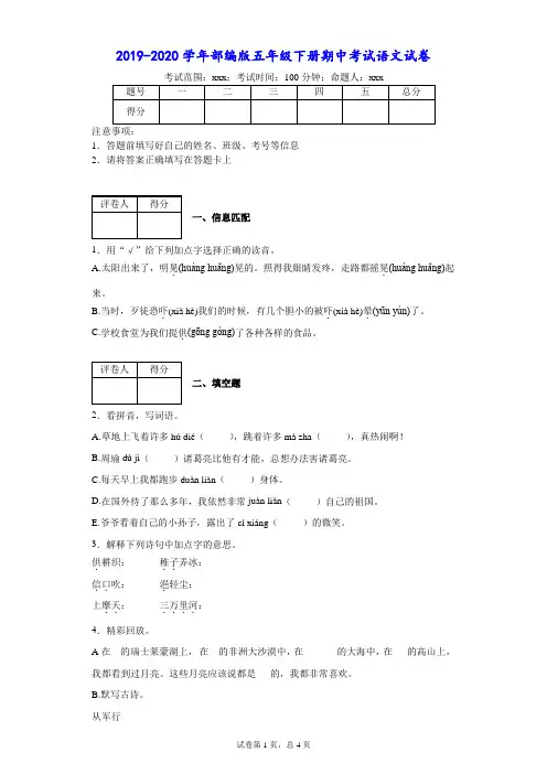 2019-2020学年部编版五年级下册期中测试语文试卷考试范围:xxx;考试时间:100分钟;命题人:xxx注意事项:1.答题前填写好自己的姓名、班级、考号等信息2.请将答案正确填写在答题卡上一、选择题1.下列各组词语中,书写完全正确的一组是()A.布置锻炼蔚问一针见血B.伤势绷带签字情不自禁C.锄头紧急荣幸神机妙蒜D.愉树拟定欺负一声不吭二、语言表达2.听短文《孙悟空龙宫借宝》,完成练习。