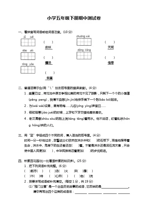 小学五年级语文下册期中测试卷一、看拼音写词语或给词语注音。