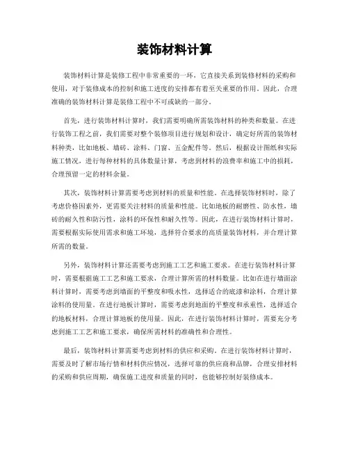 装饰材料计算装饰材料计算是装修工程中非常重要的一环,它直接关系到装修材料的采购和使用,对于装修成本的控制和施工进度的安排都有着至关重要的作用。