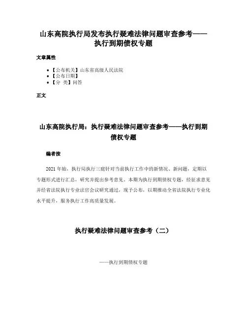 山东高院执行局发布执行疑难法律问题审查参考——执行到期债权专题文章属性•【公布机关】山东省高级人民法院•【公布日期】•【分类】问答正文山东高院执行局:执行疑难法律问题审查参考——执行到期债权专题编者按2021年始,执行局执行三庭针对当前执行工作中的新情况、新问题,定期以专题形式进行汇总,研究并提出参考意见。