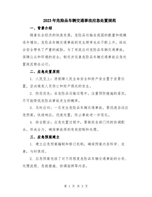 2023年危险品车辆交通事故应急处置规范一、背景介绍随着社会经济的快速发展,危险品运输在我国的数量和规模逐年增加。
