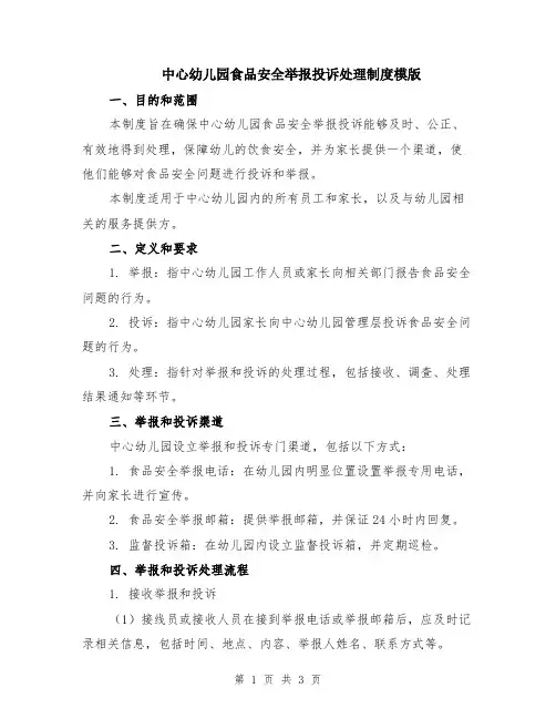 二、定义和要求1. 举报:指中心幼儿园工作人员或家长向相关部门报告食品安全问题的行为。
