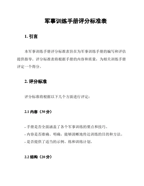 军事训练手册评分标准表1. 引言本军事训练手册评分标准表旨在为军事训练手册的编写和评估提供指导。