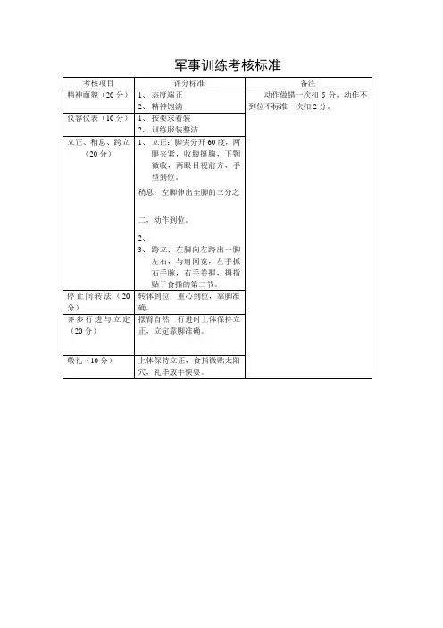 考核内容个人1.出勤率:学生须按照学校军训规定的时间参加军训活动,出勤率达到100%者得满分。