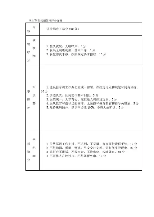 我们会通过以下途径考核学生的理论知识:•考试判断学生对军事理论的掌握程度•随堂测试反映学生对军事理论的学习情况评比考核标准为了更好地衡量学生的训练成果,我们将采用一套科学的评比考核标准:1.体能测试标准•俯卧撑:满分为50分,每完成一次得1分,不足一次不得分。