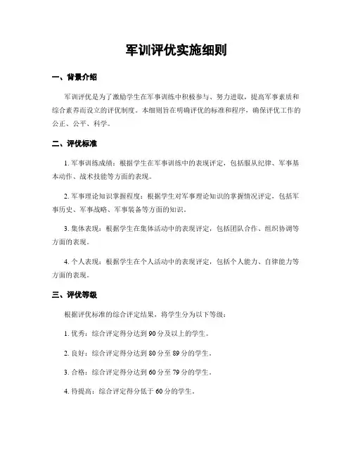 军训评优实施细则一、背景介绍军训评优是为了激励学生在军事训练中积极参与、努力进取,提高军事素质和综合素养而设立的评优制度。