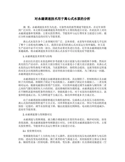 对永磁调速技术用于离心式水泵的分析摘要:永磁调速技术作为先进、可靠性高的新型调速节能技术,在近年来得到广泛应用。