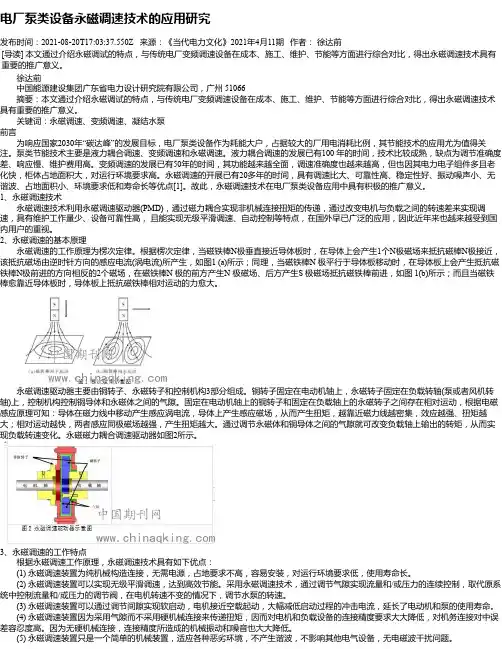 2 永磁调速技术的工作原理永磁调速技术是通过气隙传递转矩的传动设备,一般适用于水泵风机类设备,它具有高效节能、高可靠性、无刚性连接传递扭矩等特点。