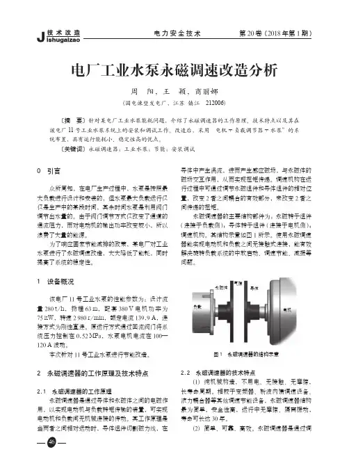 周 阳,王 颖,商丽娜(国电谏壁发电厂,江苏 镇江 212006)电厂工业水泵永磁调速改造分析〔摘 要〕 针对某电厂工业水泵能耗问题,介绍了永磁调速器的工作原理、技术特点以及其在该电厂11号工业水泵系统上的安装和调试工作。