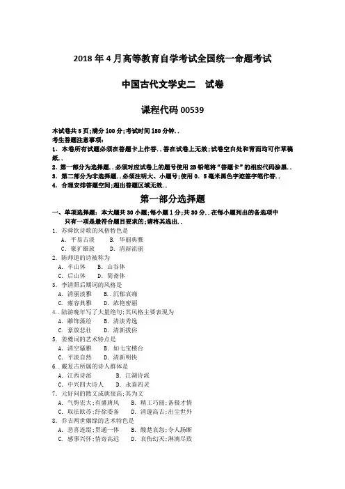 2018年4月高等教育自学考试全国统一命题考试中国古代文学史二试卷课程代码00539本试卷共5页;满分l00分;考试时间l50分钟..考生答题注意事项:1.本卷所有试题必须在答题卡上作答..答在试卷上无效;试卷空白处和背面均可作草稿纸..2.第一部分为选择题..必须对应试卷上的题号使用2B铅笔将“答题卡”的相应代码涂黑.. 3.第二部分为非选择题..必须注明大、小题号;使用0.5毫米黑色字迹签字笔作答.. 4.合理安排答题空间;超出答题区域无效..第一部分选择题一、单项选择题:本大题共30小题;每小题l分;共30分..在每小题列出的备选项中只有一项是最符合题目要求的;请将其选出..1.苏舜钦诗歌的风格特色是A.平易古淡 B. 华丽典雅C.豪犷雄放 D.清新流丽2.陈师道的诗被称为A.半山体 B.山谷体C.后山体 D.简斋体3.李清照后期词的风格是A.清丽淡雅 B..沉郁哀痛C. 雍容典雅 D.浓艳密丽4..陆游晚年写了大量绝句;其风格主要表现为A.雕饰藻绘 B.清淡秀逸C. 豪放悲壮 D.清新拔俗5.姜夔词的艺术特点是A.清空骚雅 B.如七宝楼台C.平淡自然 D.清新明快6..戴复古所属的诗人群体是A.江西诗派 B.江湖诗派C.中兴四大诗人 D.永嘉四灵7.元好问的散文成就很高;其为文A.气势宏大;有盛唐风 B.精工巧丽;备极才情C.取法欧苏;纡徐委备 D.清邃高古;出尘世外8.乔吉两世姻缘的艺术特色是A.悲喜连缀;贯通一体 B.酸楚哀怨;令人肠断C. 感事兴怀;情寄高远 D.哀伤幻灭;淋漓尽致9.王实甫西厢记取材于A.白居易长恨歌 B.民间流传的南戏C.范摅云溪友议 D.元稹的传奇小说10.“南戏”早期被称作A.昆腔 B.温州杂剧C.传奇 D.大元乐府11.萨都刺的诗文集名为A.牧庵集 B.剡源集C.雁门集 D.陵川集12.水浒传突出了“官逼民反”的主题;小说中第一个正式登场的人物是 A..鲁智深 B.林冲C.西门庆 D. 高俅13.明代着名小说金瓶梅属于A. 历史演义 B.世情小说C. 话本小说 D.神魔小说14.明永乐以后至成化末年;文坛上最为流行的文学流派是A.临川派 B.台阁体C..唐宋派 D.前七子15.代表明代散文全面繁荣和时代特征的是A.唐宋派散文 B.公安派C.晚明小品文 D.竟陵派16.高启诗歌各体兼工;尤长于A.五言古诗 B.五言律诗C.七言律诗 D.七言歌行17.明代前期作家朱有嫩的散曲集是A.诚斋乐府 B.秋碧乐府C.江东白苎 D.雍熙乐府18.明清之际的钱谦益在诗歌创作上推尊A.陶渊明 B.李白C.杜甫 D.苏轼19.诗句“恸哭六军俱缟素;冲冠一怒为红颜”出自A.赵执信晓过灵石 B.吴伟业圆圆曲C.王士稹秦淮杂诗 D.袁枚马嵬20.浙派代表诗人厉鹗在诗歌创作上工于A.四言 B.五言C.七言 D.杂言21.黄景仁都门秋思一诗的主要特色是A. 质朴苍劲 B.清新明畅C.清丽峭拔 D.闲适恬淡22.阳湖派古文的代表人物是A.黄宗羲、顾炎武、王夫之 B.方苞、刘大樾、姚鼐C.恽敬、张惠言 D. 戴震、钱大昕23.纳兰性德长相思山一程一词的题材是A.咏物 B.爱情C.边塞 D.吊古24.绿野仙踪的主要内容是A. 描写才子佳人的恋爱故事 B.演绎郑成功、张煌言海上抗清复明的史事 C.叙述冤仇相报的两世姻缘故事 D.叙写冷于冰求仙学道、救济众生的经过25.李渔笠翁传奇十种的主要题材是A.才子佳人 B. 历史故事C.政治时事 D.神怪故事26.近代“新派诗人”的代表人物是A.龚自珍、魏源 B.张维屏、贝青乔C.梁启超、黄遵宪 D.樊增祥、易顺鼎27.道光、咸丰、同治时期;占据诗坛中心的是A.同光体 B.宋诗派C.晚唐诗派 D.汉魏六朝诗派28.近代词人王鹏运开创了A.临林词派 B.阳羡词派C.浙西词派 D.常州词派29.老残游记属于A.侠义小说 B. 公案小说C.谴责小说 D.狭邪小说30.1906年;欧阳予倩、李叔同等人成立的我国第一个戏剧团体是A.和春班 B.春台班C.春阳社 D.春柳社二、多项选择题:本大题共5小题;每小题2分;共10分..在每小题列出的备选项中至少有两项是符合题目要求的;请将其选出;错选、多选或少选均无分..31.下列属于辛派词人的有A..张元斡 B.朱敦儒C.张孝祥 D.刘过E.陈亮32.宋元话本小说的艺术特征有A.连贯叙述;故事性强 B.有意制造悬念和巧合C.情节曲折符合市民心理 D.篇首或篇尾多采用诗词E.语言华美;由俗返雅33.以下话本小说属于李渔创作的有A.清夜钟 B.无声戏C.十二楼 D.豆棚闲话E.西湖佳话34.下列属于弹词特点的有A.流行于南方的讲唱文学形式 B.由说、噱、弹、唱等组成C.多用第三人称叙述 D. 有“国音”、“土音”之分E.作者多为女性35.以下小说属于林纾翻译的有A.巴黎茶花女遗事 B.滑铁卢战血余腥录C.黑奴吁天录 D.撒克逊劫后英雄录E.海上花列传第二部分非选择题三、名词解释题:本大题共4小题;每小题3分;共12分.. 36.白体37.国朝文派38.常州词派39.曾国藩的古文理论四、简答题:本大题共4小题;每小题5分;共20分.. 40.简述苏轼记叙文的艺术特点..41.概述关汉卿杂剧创作的内容分类..42.简述镜花缘的思想意义..43.简述清忠谱的主要内容..五、论述题:本大题共2小题;每小题l4分;共28分.. 44.试论柳永对词体的贡献..45.试述牡丹亭的思想内涵和艺术成就..。
