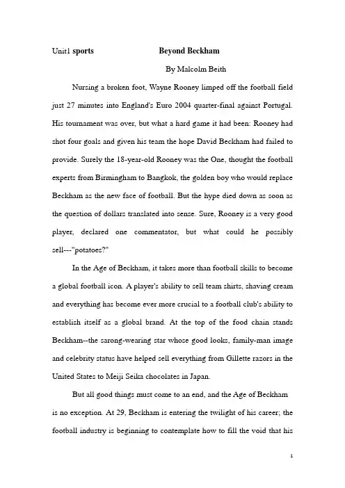 Unit1 sports Beyond BeckhamBy Malcolm BeithNursing a broken foot, Wayne Rooney limped off the football field just 27 minutes into England's Euro 2004 quarter-final against Portugal. His tournament was over, but what a hard game it had been: Rooney had shot four goals and given his team the hope David Beckham had failed to provide. Surely the 18-year-old Rooney was the One, thought the football experts from Birmingham to Bangkok, the golden boy who would replace Beckham as the new face of football. But the hype died down as soon as the question of dollars translated into sense. Sure, Rooney is a very good player, declared one commentator, but what could he possibly sell---"potatoes?"In the Age of Beckham, it takes more than football skills to become a global football icon. A player's ability to sell team shirts, shaving cream and everything has become ever more crucial to a football club's ability to establish itself as a global brand. At the top of the food chain stands Beckham--the sarong-wearing star whose good looks, family-man image and celebrity status have helped sell everything from Gillette razors in the United States to Meiji Seika chocolates in Japan.But all good things must come to an end, and the Age of Beckham is no exception. At 29, Beckham is entering the twilight of his career; the football industry is beginning to contemplate how to fill the void that hisdecline as a player and eventual retirement will create. Indeed, that question was on the minds of many of the world's club bosses and marketing executives who attended the annual football trade fair in Dubai, United Arab Emirates in early December 2004. Newcastle United chairman Freddy Shepherd declared frankly that Manchester United had lost some of its "stardust" since letting Beckham transfer to Real Madrid in 2003. Now the whole industry is worried about losing its brightness.There is no obvious candidate to fill Beckham's Gucci shoes. Rooney, 19, is too uninspiring off the field; the pug-faced Liverpudlian has only local appeal and lacks a celebrity reputation. The same goes for Real Madrid's Michael Owen, although he's cute enough to female fans. Other stars, like Manchester United's Portuguese passionate Cristiano Ronaldo, Italian Francesco Totti of AS Roma, Argentine wonder boy Javier Saviola of Monaco and Arsenal's No. 1 Frenchman Thierry Henry have potential. But their global range is limited by one important factor: "They don't have the English-language feature," says Dominic Malcolm, a sports-economics lecturer at the University of Leicester and author of The Future of Football. Speaking English has come to be regarded as a vital asset for any footballer hoping to win over fans from Buenos Aires to Bangkok. It is generally believed that the next Beckham may well have to be English or American, just as most global pop icons are.The lack of such a figure is leading European club executives andsponsors to concentrate on filling region-specific marketing needs, particularly in Asia, which is now seen as the merchandising gold mine that could help bring Europe's ailing teams out of the red. When Crystal Palace signed Chinese stars Fan Zhiyi and Sun Jihai in 1998, the club's products flew off shelves across China, and created instant brand-name recognition. Tottenham enjoyed a similar effect with Japanese striker Kazuyuki Toda last year, as did Parma with Japanese star Hidetoshi Nakata, who is now at Fiorentina. "We're seeing players signed in Europe because of the commercial opportunity they open up," says Malcolm. "It enables a football club as a brand to expand into a market." Consider this: When Chinese star Li Tie's Everton plays against Manchester City, where Sun Jihai now plays, an estimated 300 million Chinese watch the match (less than 1 million Brits tune in--and that's if Rupert Murdoch's BSkyB chooses to broadcast it).Some critics argue that teams are sacrificing quality in this quest to build international brands. Many of the Asian players transferred to Europe have failed dismally on the field--Toda, for instance, played just four games before being sent back to a Japanese club. This prompted Mohammed bin Hammam, the head of the Asian Football Confederation, to accuse European clubs of exploiting Asian players as "slaves" for commercial purposes earlier this year, demanding instead that they hire Asians on playing ability alone. Nevertheless, some teams are going outof their way to help raise player quality along with their reputations; Stockport County FC in Britain's Division One plays annual exhibitions in China and offers training scholarships to local players. "Recruiting players has to be purely about talent," says a former executive of one big-name English club. "If the player has marketing value, it's a bonus--but not the reason. If you do that you start to endanger the integrity of sporting principles."Perhaps, but these principles have largely died in recent years, as satellite television dragged football from its local, small roots and transformed it into a multibillion-dollar industry that favored branding over ball skills. As the footballing world moves into a new era, desperately seeking its new cash cow--or cows--few clubs or sponsors are listening to the old timers. Some still dream of finding the One, perhaps in an American like Washington DC United's 15-year-old Ghanaian born Freddy Adu, who has endorsement deals with everyone from Nike to Campbell's soup, and has helped raise attendance at his games this past season to 50 percent above average. "It may be that the person who rivals Beckham is going to be the person most closely linked to the American team when it eventually wins the World Cup," speculates Malcolm.Others think that's not likely ever to happen. So, when Beckham finally fades into the history books, as Bill Gerard, a professor of sports management and finance at Leeds University Business School, puts it, "itwill be a case of 'The king is dead. Long live the king.'" Th