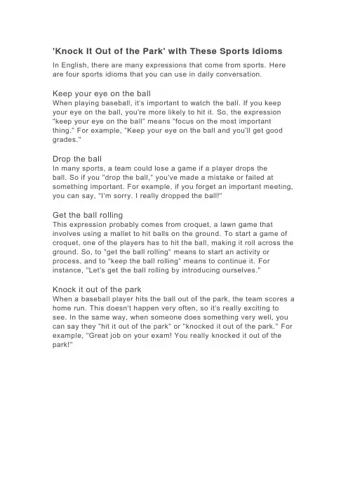 'Knock It Out of the Park' with These Sports IdiomsIn English, there are many expressions that come from sports. Here are four sports idioms that you can use in daily conversation.Keep your eye on the ballWhen playing baseball, it's important to watch the ball. If you keep your eye on the ball, you're more likely to hit it. So, the expression "keep your eye on the ball" means "focus on the most important thing." For example, "Keep your eye on the ball and you'll get good grades."Drop the ballIn many sports, a team could lose a game if a player drops theball. So if you "drop the ball," you've made a mistake or failed at something important. For example, if you forget an important meeting, you can say, "I'm sorry. I really dropped the ball!"Get the ball rollingThis expression probably comes from croquet, a lawn game that involves using a mallet to hit balls on the ground. To start a game of croquet, one of the players has to hit the ball, making it roll across the ground. So, to "get the ball rolling" means to start an activity or process, and to "keep the ball rolling" means to continue it. For instance, "Let's get the ball rolling by introducing ourselves."Knock it out of the parkWhen a baseball player hits the ball out of the park, the team scores a home run. This doesn't happen very often, so it's really exciting to see. In the same way, when someone does something very well, you can say they "hit it out of the park" or "knocked it out of the park." For example, "Great job on your exam! You really knocked it out of the park!"。