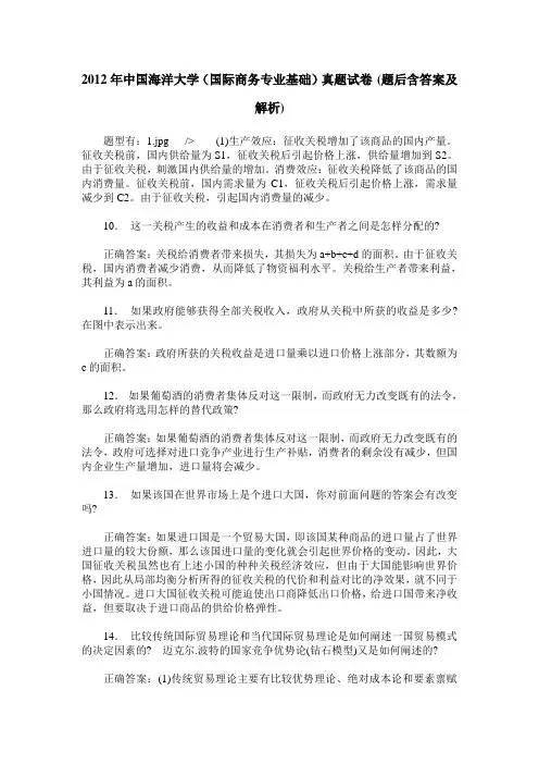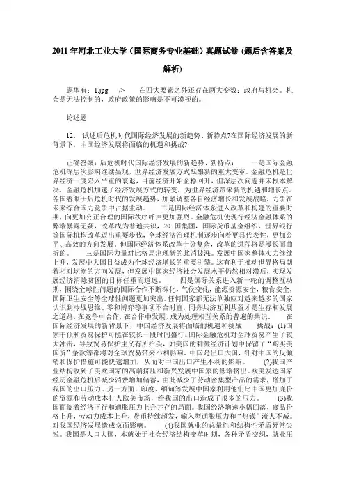 2012年东北财经大学(国际商务专业基础)真题试卷(题后含答案及解析)全部题型 3. 名词解释7. 简答题9. 案例分析题10. 论述题名词解释1.有效保护率正确答案:指整个关税制度(和有效保护措施)对某类产品在其生产过程中给予净重增值的影响。