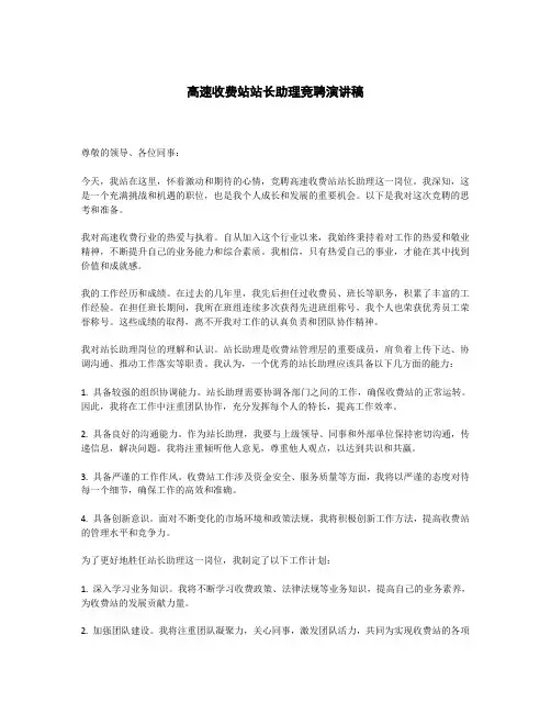 高速收费站站长助理竞聘演讲稿尊敬的领导、各位同事:今天,我站在这里,怀着激动和期待的心情,竞聘高速收费站站长助理这一岗位。