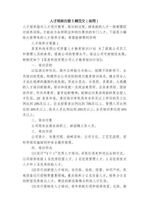 人才培养方案范文(实用)人才培养方案范文一、引言在现代社会,人才是国家发展的核心竞争力,也是企业持续发展的重要保障。