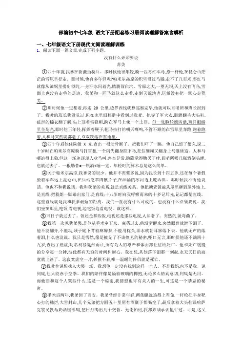 初中七年级语文下册配套练习册阅读理解答案及答案一、七年级语文下册现代文阅读理解训练1.阅读下文,完成下列小题。