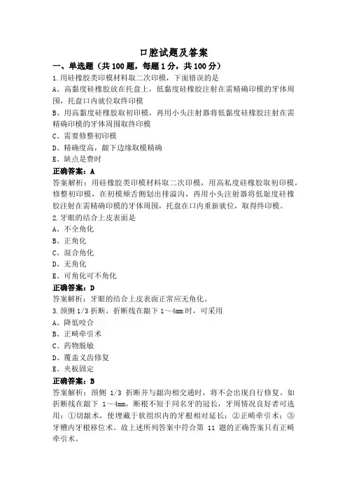 口腔试题及答案一、单选题(共100题,每题1分,共100分)1.用硅橡胶类印模材料取二次印模,下面错误的是A、高黏度硅橡胶放在托盘上,低黏度硅橡胶注射在需精确印模的牙体周围,托盘口内就位取终印模B、用高黏度硅橡胶取初印模,再用小头注射器将低黏度硅橡胶注射在需精确印模的牙体周围取终印模C、需要修整初印模D、精确度高,龈下边缘取模精确E、缺点是费时正确答案:A答案解析:用硅橡胶类印模材料取二次印模,用高私度硅橡胶取初印模,修整初印模,在初模颊舌侧划出排溢沟,再用小头注射器将低耻度硅橡胶注射在需精确印模的牙体周围,托盘在口内重新就位,取得终印模。