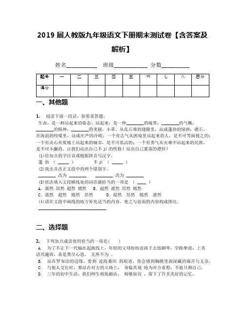 2019年审定新版教材精编版部编人教版九年级下册语文期末试卷(全卷四个大题,共27个小题,共8页;满分120分,考试用时150分钟)一、语文基础知识积累 (1-~6题,每题2分,第7题8分,共20分)1.下列词语中加点字注音完全正确的一项是()A. 蹒.跚(mán) 嫉.妒(jí) 古刹. (chà) 溯.流而下(shuò)B. 亘.古(gèn) 妩.媚(fǔ) 褴褛. (lǚ) 广袤无垠. (yín)C.对称. (chèn) 迸.溅(bèng) 押解.(xiè) 断壁残垣.(yuán)D.血渍. (zì) 酿.造(niàng) 诘.责(jié) 相形见绌.(chù)2.下列词语中没有错别字的一项是()A.晦喑暄闹通宵达旦抑扬顿挫B.濒临分歧险象迭生史无前列C.慰藉松弛砰然心动蛛丝马迹D.笨拙座右铭怒不可遏不卑不亢3.下列句子中加点词语使用有误的一项是()A.“一带一路”已成为家喻户晓....的话题。