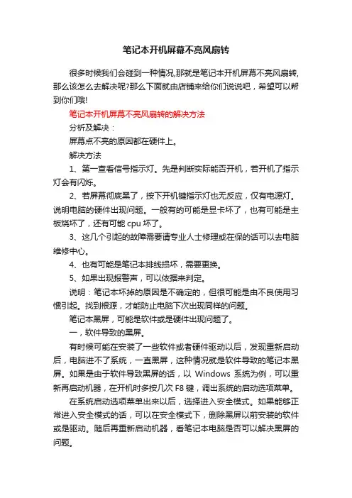一、检查硬件故障1. 确保电脑连接正常:检查电源线、显示屏线缆、显卡插槽等连接是否紧固无误,确保信号正常传输。