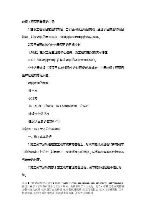 项目管理的类型:·业主方·设计方·施工方(施工总承包、施工总承包管理、分包方)·建设物资供货方·建设项目总承包方(EPC)知识点:施工成本分析与考核一、施工成本分析1.施工成本分析是在施工成本核算的基础上,对成本的形成过程和影响成本升降的因素进行分析,以寻求进一步降低成本的途径,包括有利偏差的挖掘和不利偏差的纠正。