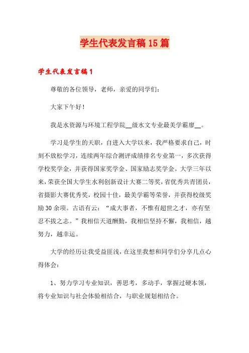 学生代表发言稿优秀范文篇1尊敬的各位老师,亲爱的同学们:大家晚上(下午)好,是我来自某学院某专业某班的某某,很高兴今天能在这里,和在座的各位交流我走过的四年大学生活,我的成长历程以及种种感悟。