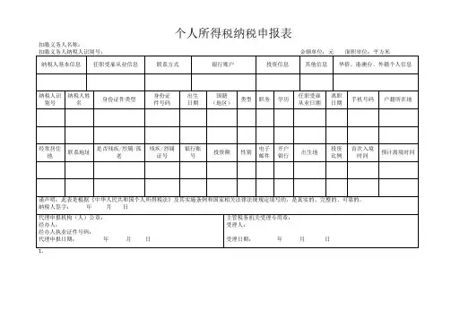 A06868<纳税人盖公章区>个人所得税扣缴申报表税款所属期: 年 月 日至 年 月 日扣缴义务人名称:扣缴义务人纳税人识别号(统一社会信用代码):□□□□□□□□□□□□□□□□□□□□金额单位:人民币元(列至角分)《个人所得税扣缴申报表》表单说明一、适用范围本表适用于扣缴义务人向居民个人支付工资、薪金所得,劳务报酬所得,稿酬所得和特许权使用费所得的个人所得税全员全额预扣预缴申报;向非居民个人支付工资、薪金所得,劳务报酬所得,稿酬所得和特许权使用费所得的个人所得税全员全额扣缴申报;以及向纳税人(居民个人和非居民个人)支付利息、股息、红利所得,财产租赁所得,财产转让所得和偶然所得的个人所得税全员全额扣缴申报。