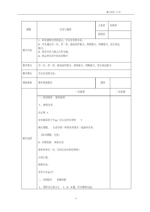 学生小组活动(4分钟)汇报交流三、课堂小结今天同学们都学到了哪些知识?这些知识对你有什么帮助?板书设计:分类与整理(单一标准)按种类分按颜色分教学后记课题分类与整理主备者余海英使用者教学目标1.学会分同一类物品,并按照多种标准分类,感知分类的意义。