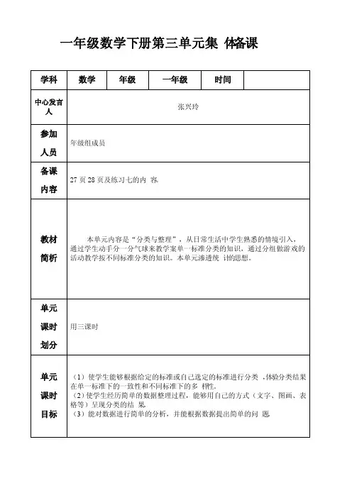 一年级数学下册第三单元集体备课学科数学年级一年级时间中心发言人张兴玲参加人员年级组成员备课内容27页28页及练习七的内容。