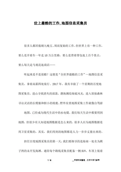 二、工作职责地图采集员的工作职责包括但不限于以下几个方面:1. 地理数据采集地图采集员通过实地勘测、传感器、卫星遥感等手段采集地理信息数据,如地面高程、土地利用、道路网络、建筑物等。