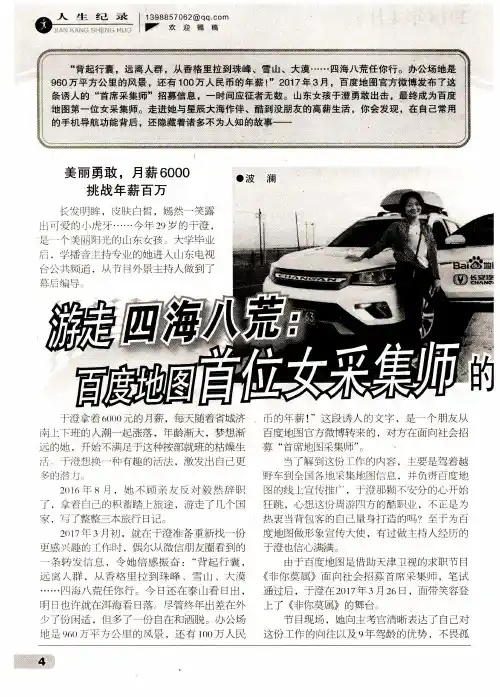 20l7年3月初.就在于澄准备 重新找一份更感兴趣的工作时.偶 尔从微信朋友圈看到了一条转发信 息,令她倍感振奋:“背起行囊,远离 人群.从香格里拉到珠峰、雪山、大 漠……四海八荒任你行 今日还在 泰山看日出.明日也许就在洱海看 日落 尽管终年出差在外少了份闲 适.但多了一份自在和洒脱。办公场 地是960多万平方公里的风景.还有100万 人民币的年薪!”这段诱人的文字,是一个 朋友从百度地图官方微博转来的.对方在 面向社会招募“首席地图采集师” 当了解到这份工作的内容.主要是驾 着越野车全国各地的采集地图信息.并负 责百度地图的线上宣传推广.于澄那颗不 安分的心开始狂跳.心想这份周游四方的 酷职业.不正是为热衷当背包客的自己量 身打造的吗?至于为百度地图做形象宣传 大使.有过主持经历的于澄也信心满满。 由于百度地图是借助天津卫视的求职 节目《非你莫属》,面向社会招募首席采集师 的,笔试通过后.于澄在2017年3月26日, 面带阳光笑容登上了《非你莫属》的舞台。