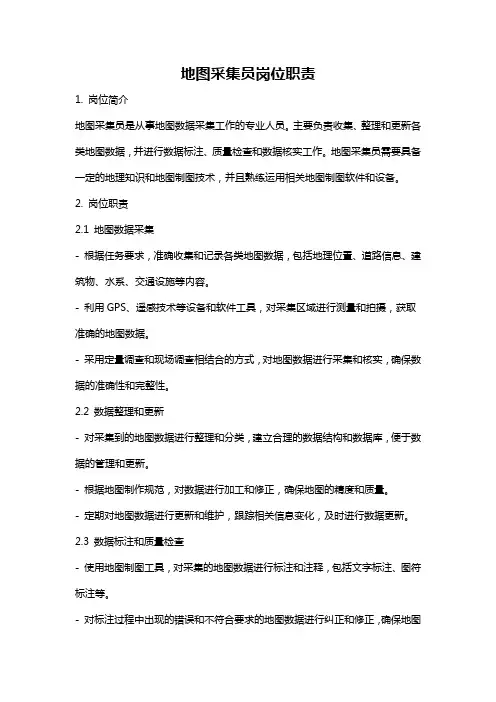地图采集员岗位职责1. 岗位简介地图采集员是从事地图数据采集工作的专业人员。