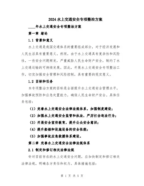 水上交通安全专项整治方案一、背景介绍随着经济的快速发展和人民生活水平的提高,水上交通运输在我国的重要性日益突出。