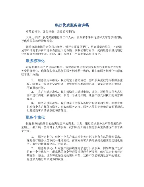 银行优质服务演讲稿银行优质服务演讲稿精选2篇(一)尊敬的评委、各位领导、亲爱的同事们:大家下午好!我很荣幸可以站在这里,与大家分享我对银行优质效劳的理解与见解。