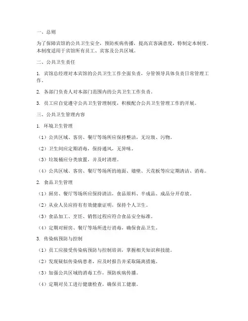 一、总则为了保障宾馆的公共卫生安全,预防疾病传播,提高宾客满意度,特制定本制度。